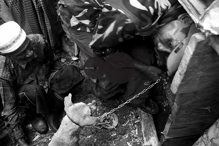 Assistant of Syarwani Sabi (a traditional tiger tamer), pulling a dog (bait) into the trap for trapping a tiger. Meukek, Banda Aceh, Indonesia. October 15,2007.