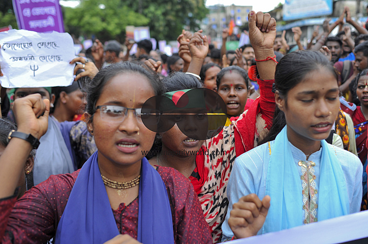 • Description: Sylhet, Bangladesh. 11th August 2024. Bangladeshi Hindu community members gather in a protest against the attacks on Hindu homes, temples and shops in various parts of the country after former Prime Minister Sheikh Hasina had resigned and fled the country amid violent protests over the government's job quota system. The procession started from the religious organization ISKCON'S premises and ended at the central Sylhet Shaheed Minar premises.