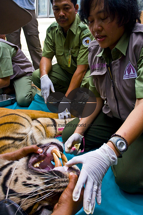 An officer checking the condition of a Sumatra tiger, Panthera tigris sumatrae, in Badan Konservasi Sumber Daya Alam or BKSDA, a Natural Resource Conservation Agency in Banda Aceh,in Aceh Province of Indonesia. June 26, 2008..The Sumatran tiger, or Panthera tigris sumatrae, is the world's most critically endangered tiger subspecies. WWF estimates that a fewer than 400 remain in the wild today in comparison to about 1,000 in the 1970s.