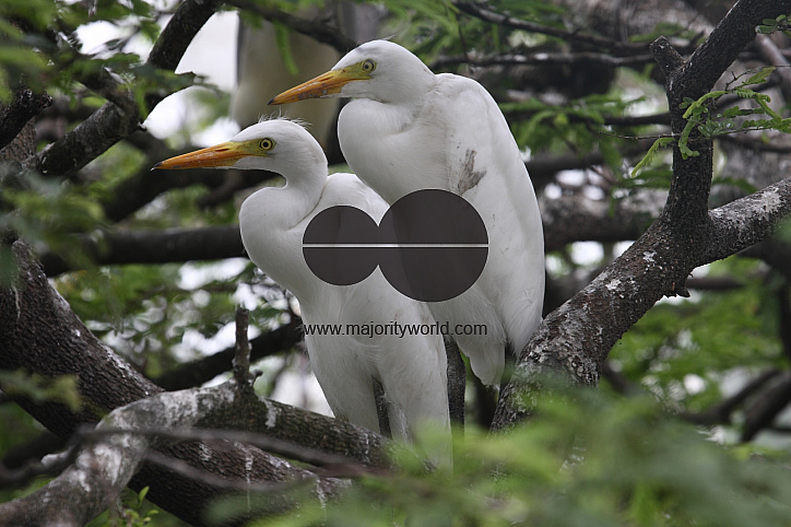 The Cattle Egret (Bubulcus ibis) locally known as ‘go bok’ is a small white heron found near water-bodies, cultivated fields, usually near grazing cattle. Srimongol, Shylhet, Bangladesh. June 22, 2007.