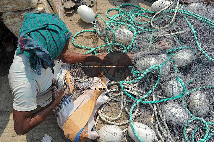 • Description: Along the banks of the Karnaphuli River at Fishery Ghat, fishermen repair their nets during the 58-day fishing ban imposed by the government in the Bay of Bengal. Many however claim they have not received the promised government rations, leaving them struggling to make ends meet. Chittagong, Bangladesh.
