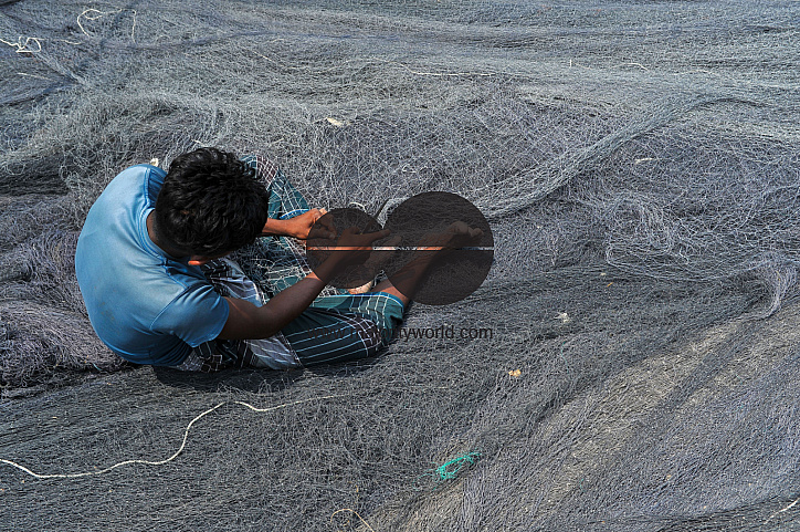 Along the banks of the Karnaphuli River at Fishery Ghat, fishermen repair their nets during the 58-day fishing ban imposed by the government in the Bay of Bengal. Many however claim they have not received the promised government rations, leaving them stru