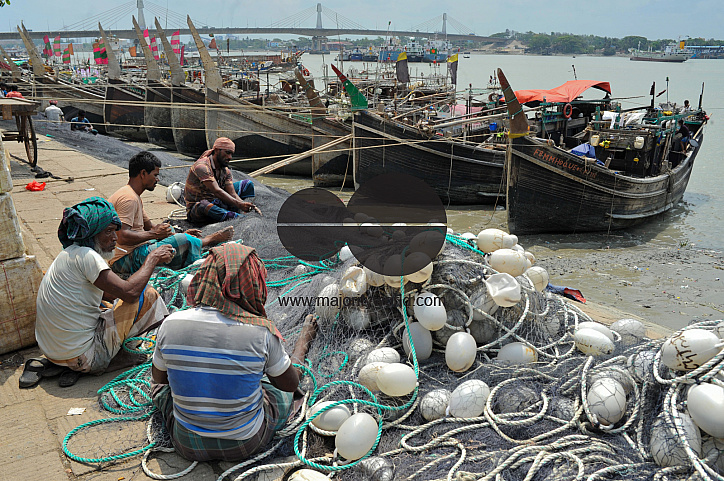 Along the banks of the Karnaphuli River at Fishery Ghat, fishermen repair their nets during the 58-day fishing ban imposed by the government in the Bay of Bengal. Many however claim they have not received the promised government rations, leaving them stru