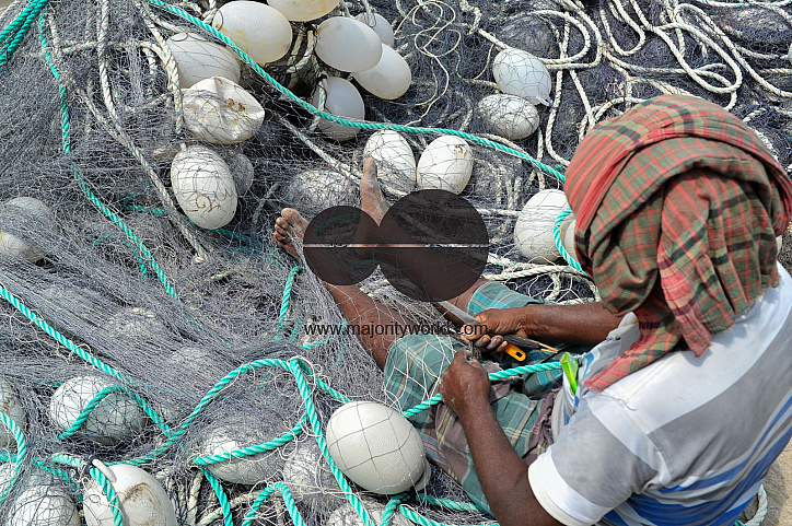 • Description: Along the banks of the Karnaphuli River at Fishery Ghat, fishermen repair their nets during the 58-day fishing ban imposed by the government in the Bay of Bengal. Many however claim they have not received the promised government rations, leaving them struggling to make ends meet. Chittagong, Bangladesh.
