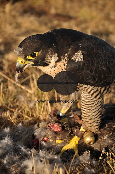 A female Peregrine Falcon, Falco peregrinus, with its prey. Africa. May 2009. Also known as Peregrine these are large birds of prey found nearly everywhere on earth, except extreme Polar Regions, very high mountains, and most tropical rainforests. They can reach speeds over 322 km/h (200 mph) in a dive, making them the fastest animal in the world. Trained Falcons are used in Falconry or Hawking, a sport in which birds of prey are used to hunt or catch game.