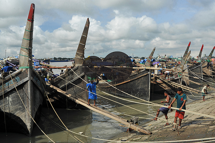 A man balances a loaded basket on his head while walking along the wooden beams from the fishing boats at Fishery Ghat. Under looming monsoon clouds, fishermen and children move through the busy waterfront, showcasing the daily rhythm of one of Bangladesh