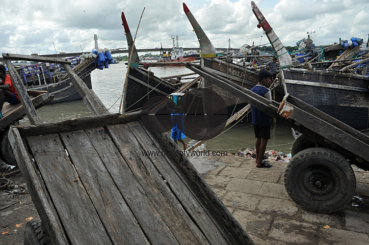 A man balances a loaded basket on his head while walking along the wooden beams from the fishing boats at Fishery Ghat. Under looming monsoon clouds, fishermen and children move through the busy waterfront, showcasing the daily rhythm of one of Bangladeshâs vital maritime hubs. Chattogram, Bangladesh.