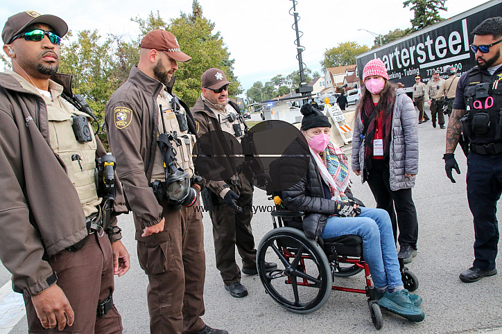 A Broadview Policeman and a Sheriff’s police try to get a protester in a wheelchair onto the sidewalk and designated protest area outside the ICE Detention Center on 25th Street and Harvard in Broadview, IL. The Broadview Mayor set hours of protest betwee