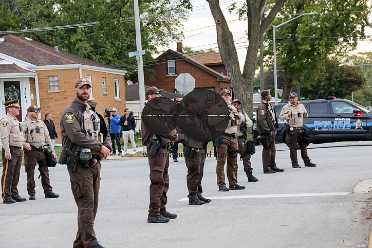 • Image Description: Sherrif’s police and Illinois State police are on hand to keep protesters under control and ensure their safety outside the ICE Detention Center on 25th Street and Harvard in Broadview, IL. The Broadview Mayor set hours of protest between 9 AM and 6PM, an