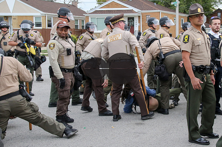 Sherrif’s police detain a protester outside the ICE Detention Center on 25th Street and Harvard in Broadview, IL. The Broadview Mayor set hours of protest between 9 AM and 6PM, and within designated protest zones behind concrete barriers. USA.