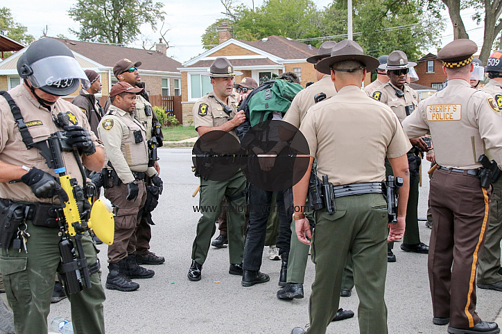 • Description: Sherrif’s police detain a protester outside the ICE Detention Center on 25th Street and Harvard in Broadview, IL. The Broadview Mayor set hours of protest between 9 AM and 6PM, and within designated protest zones behind concrete barriers. USA.