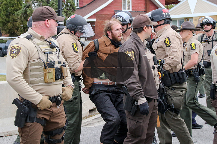 Sherrif’s police detain a protester outside the ICE Detention Center on 25th Street and Harvard in Broadview, IL. The Broadview Mayor set hours of protest between 9 AM and 6PM, and within designated protest zones behind concrete barriers. USA.