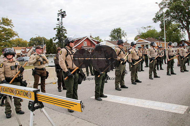 Sherrif’s police form a line to keep protesters from blocking cars coming into the ICE Detention Center on 25th Street and Harvard in Broadview, IL. The Broadview Mayor set hours of protest between 9 AM and 6PM, and within designated protest zones behind