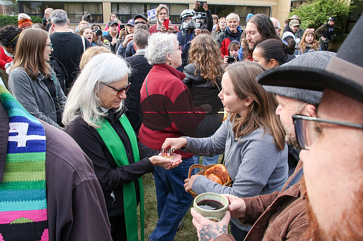• Image Description: A minister leads the protesters in some chants outside the ICE Detention Center on 25th Street and Harvard in Broadview, IL. The Broadview Mayor set hours of protest between 9 AM and 6PM, and within designated protest zones behind concrete barriers. USA.