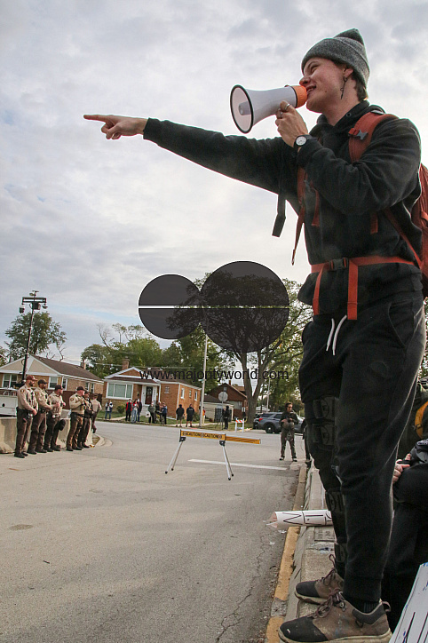 • Description: Protesters shout at the incoming vehicles outside the ICE Detention Center on 25th Street and Harvard in Broadview, IL. The Broadview Mayor set hours of protest between 9 AM and 6PM, and within designated protest zones behind concrete barriers. USA.