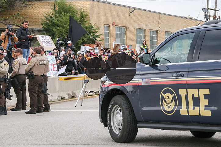 Protesters shout at the incoming vehicles outside the ICE Detention Center on 25th Street and Harvard in Broadview, IL. The Broadview Mayor set hours of protest between 9 AM and 6PM, and within designated protest zones behind concrete barriers. USA.