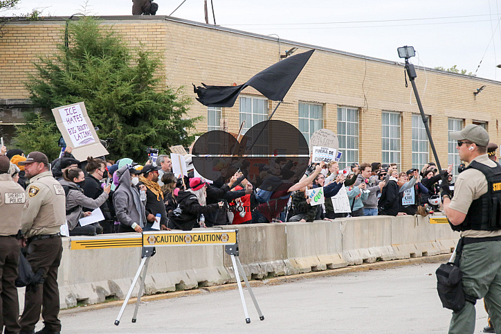 • Description: Protesters shout at the incoming vehicles outside the ICE Detention Center on 25th Street and Harvard in Broadview, IL. The Broadview Mayor set hours of protest between 9 AM and 6PM, and within designated protest zones behind concrete barriers. USA.