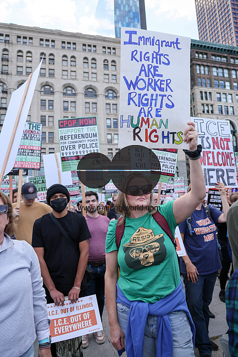 • Image Description: Thousands gathered for the No Trump No Troops rally and march in downtown Chicago. Protesters came to voice their opposition to President Trump’s threats to deploy federal troops and ICE agents into the city. Illinois USA.