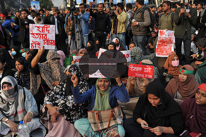 • Image Description: 29th December 2025. Chattogram, Bangladesh. Inqilab Mancha staged a sit-in demonstration in Chattogram, demanding justice for the murder of Shaheed Osman Hadi, a pioneer of the Bangladesh–India anti-hegemony movement.