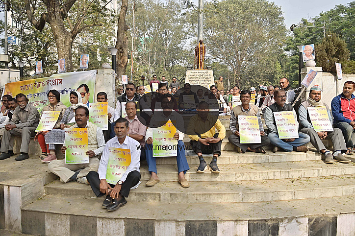 • Image Description: Congress leaders and supporters during a protest of fast against the central government's decision to end MGNREGA and replace with alternative scheme, at Gandhi Bedi in Agartala. Tripura, India.