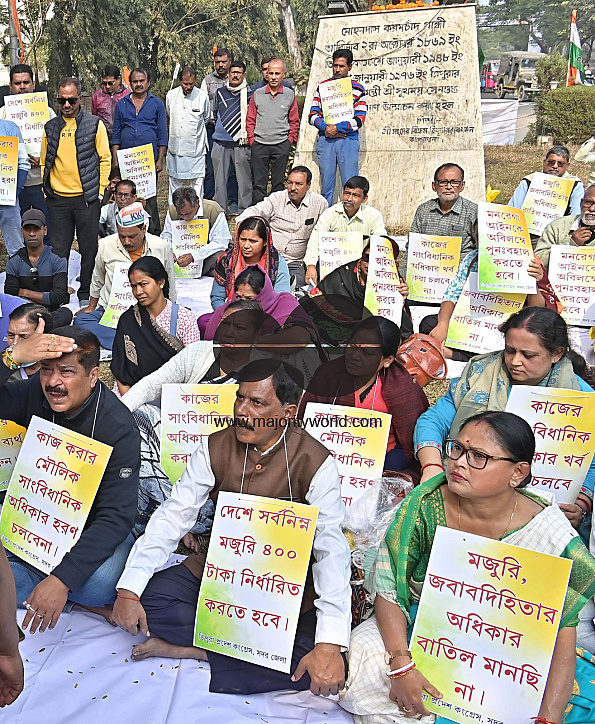 • Image Description: Congress leaders and supporters during a protest of fast against the central government's decision to end MGNREGA and replace with alternative scheme, at Gandhi Bedi in Agartala. Tripura, India.