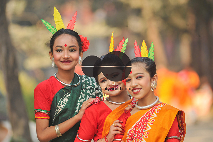 • Image Description: Young girls dressed in traditional Hill Tracts attire perform a cultural dance during the Bosonto (spring) celebration in Chattogram. The festival marks the arrival of spring with vibrant costumes, music, and traditional performances that reflect the rich