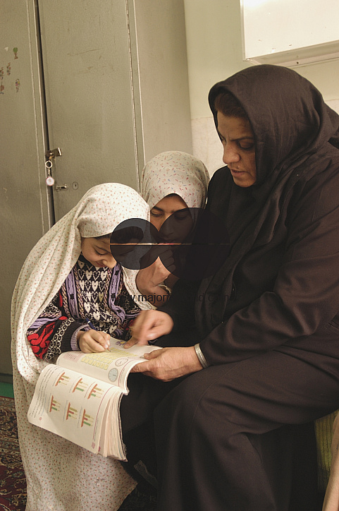 A caretaker assists young girls to do their home-work at Maawin Nursery, an orphanage run by Kerman Welfare Organization. These children are victims of recent massive earthquake in Bam. The earthquake took place in December 2004 leaving the city of Bam e