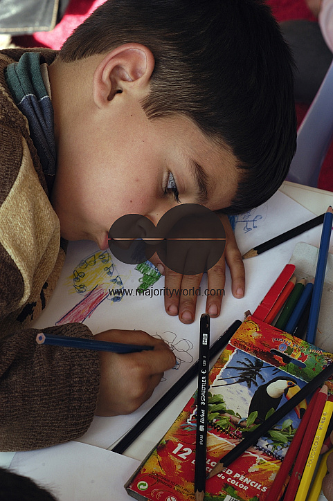 A young boy engrossed in drawing in a rural day-care centre at Nazokolya, a village in western Azerbaijan province in Iran. Jnauary 21, 2004.