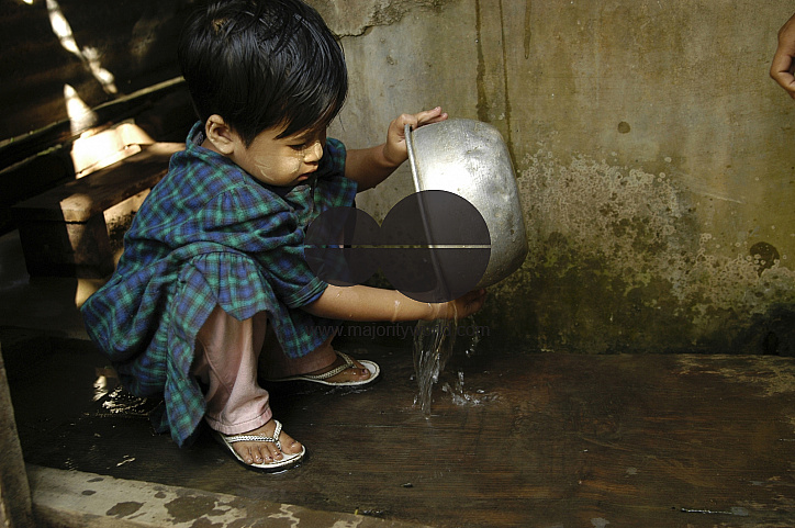 A female teacher assists a young girl to wash her hand with soap and clean water after using a sanitary latrine in a Pre School run by a Baptist Church in North Khway Ye village in Pyay district. Myanmar.