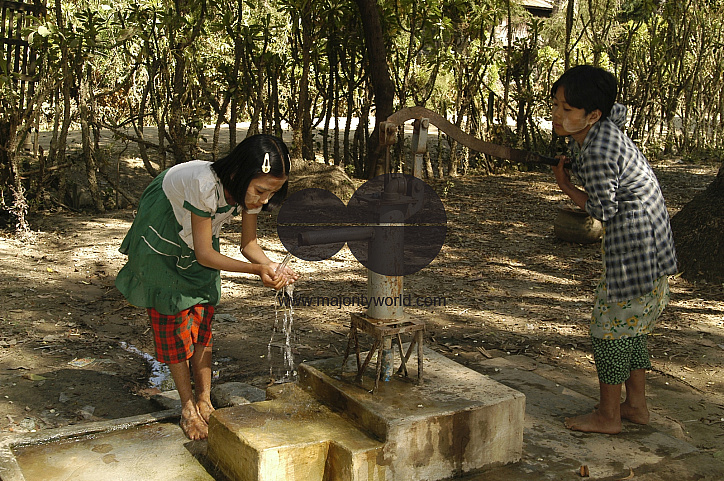 A young girl washes her hands before drinking water from a handpump in a government primary school in North Khway Ye village in Pyay district. Myanmar.