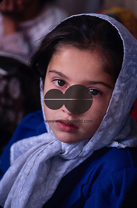 Head covered in a scarf, an Afghan girl child in a home based school for young children run by an NGO called GWA (General Work & Development Association) in Kabul. Girls learn to read and write in this school.