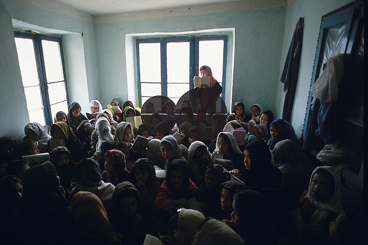 Sitting in every available space in a overcrowded classroom, girls read from their textbooks at Dasht-e-Barchi Education Centre #1 in Kabul, the capital. The school, serving 800 students who are taught in 3 shifts by 15 teachers, lacks panes, heat, furniture, carpets and lights. The teachers are not paid and many have no professional training. With separate classrooms for girls and boys, the school is 1 of 95 run by the local NGO Sorvach.
