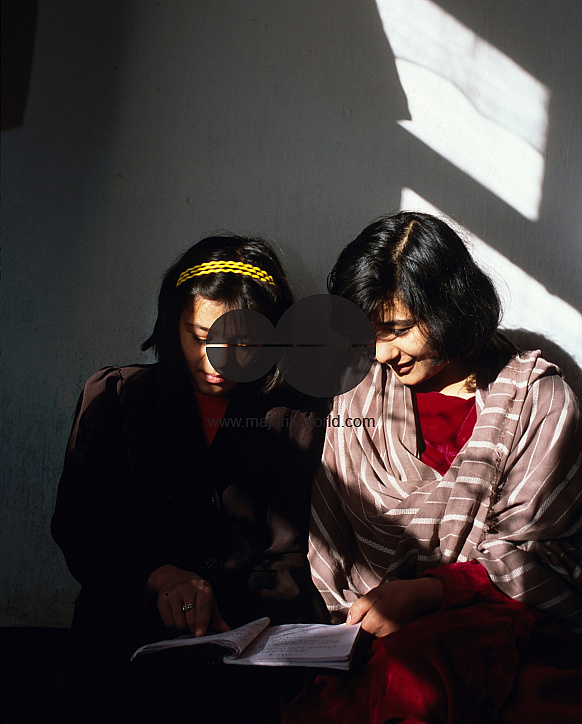 Nadia (left side), 10, is helped with her reading by her older sister Maria, 17, in their home in the Khairkhana neighbourhood of Kabul, the capital. Maria, behind in her own studies, takes literacy and embroidery classes at a recently opened non-formal educational centre for adolescent and other young women who previously could not attend school. She also helps her sister, Bashira, who operates a home-based school, part of a network of UNICEF-assisted schools run by the General Work and Development Association (GWA), a local NGO. Bashira's earnings, the equivalent of US $5-$10 per month, support their entire family.
