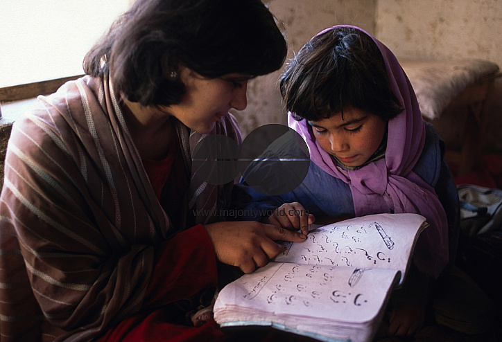 Maria (left, in red dress and brown shawl), 17, helps one of several girl students with a reading assignment, seated together in a circle in her home in the Khairkhana neighbourhood of Kabul, the capital. Maria is assisting her sister, Bashira, 18, who operates a school for 23 students. Bashira's earnings, the equivalent of US $5-$10 per month, support their entire family. (Their father was killed by a rocket shell in 1993.) Maria also attends a recently opened non-formal educational centre for adolescent and other young women who previously could not attend school. Both Bashira's home-based school and the educational centre are part of a network of UNICEF-assisted schools run by the General Work and Development Association (GWA), a local NGO. UNICEF provides textbooks and other school supplies to home-based schools and, in some cases, also assists with teacher salaries.