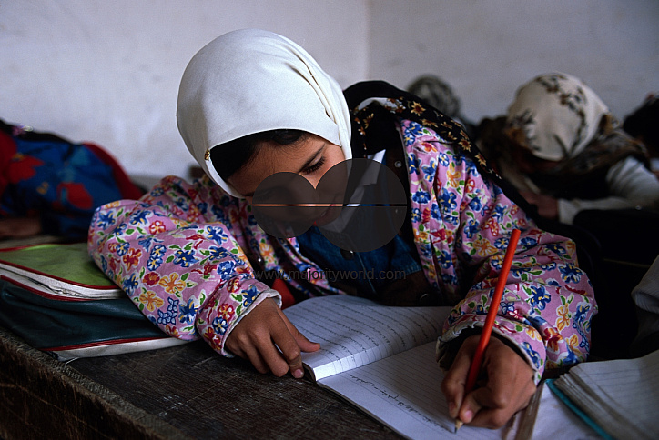 Sitting amongst many other students, a girl writes in her text book in a fourth grade class at the Al-Majida Al-Iraqia Primary School for Girls in the southern governorate of Thiqar, some 350 km south of Baghdad, the capital..Additional Info:.Until January 2003, the situation of children and women in Iraq remains critical. One million children under five in southern and central Iraq continue to suffer from chronic malnutrition. Some 60 per cent of the entire population depend on monthly Government food rations, making them extremely vulnerable to any disruption in these supplies in the event of conflict. Widespread poverty and crumbling infrastructure, the result of years of conflict and 12 years of international economic sanctions, have affected all sectors, including massive deterioration of the country's water and sanitation systems.