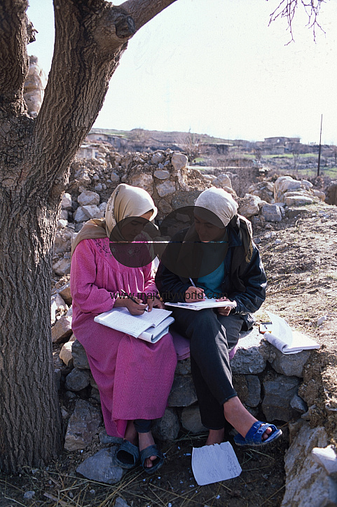Two adolecent girls, (letf-right) Chiman and Herow, study together, sitting under a tree un the village of Kannikhan, some 65 km west of the city of Sulemania in the autonomous northern region of Iraq..Additional Info:.Until January 2003, the situation of children and women in Iraq remains critical. One million children under five in southern and central Iraq continue to suffer from chronic malnutrition. Some 60 per cent of the entire population depend on monthly Government food rations, making them extremely vulnerable to any disruption in these supplies in the event of conflict. Widespread poverty and crumbling infrastructure, the result of years of conflict and 12 years of international economic sanctions, have affected all sectors, including massive deterioration of the country's water and sanitation systems.