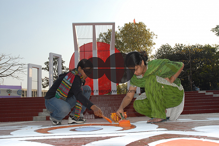 Students of the Institute of Fine Arts painting alpona (color designs) on the road in front of Shahid Minar (Martyr's Monument) 8 hours before the occasion of the International Mother Language Day on 21 February 2007. Dhaka, Bangladesh.