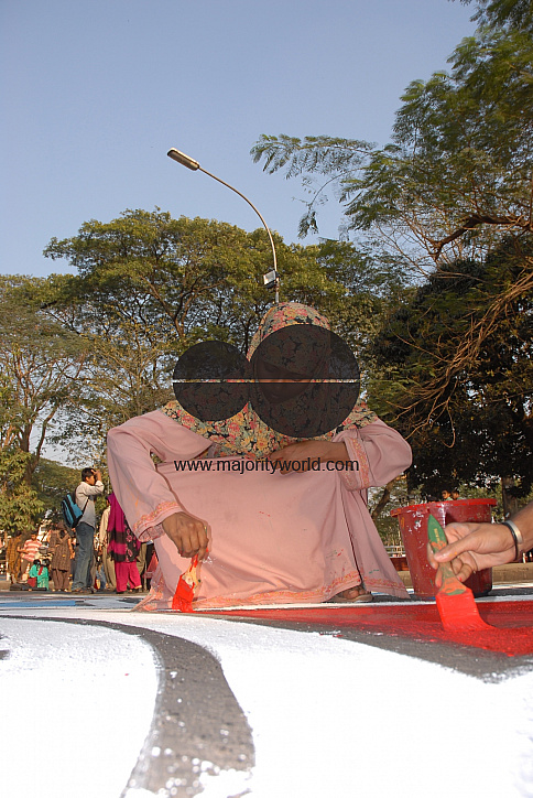 Students of the Institute of Fine Arts paint alpona (color designs) on the road in front of Shahid Minar (Martyr's Monument) 8 hours before the occasion of the International Mother Language Day on 21 February 2007. Dhaka, Bangladesh.