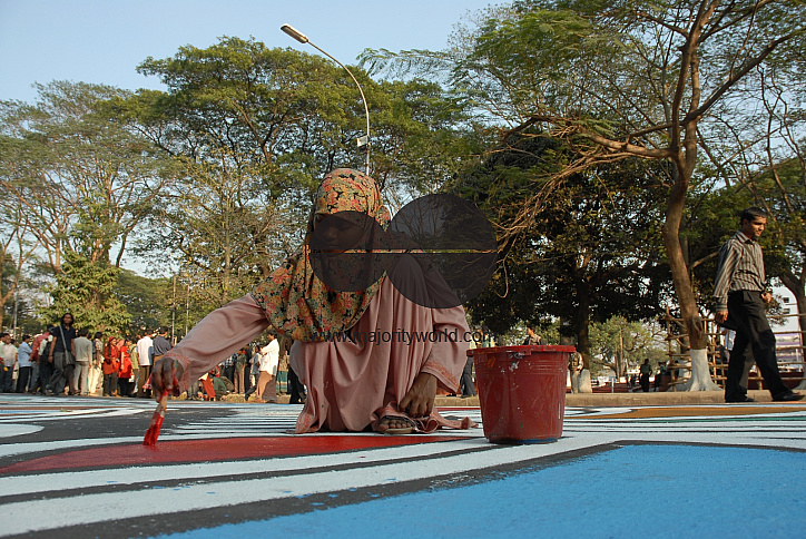 Students of the Institute of Fine Arts paint alpona (color designs) on the road in front of Shahid Minar (Martyr's Monument) 8 hours before the occasion of the International Mother Language Day on 21 February 2007. Dhaka, Bangladesh.