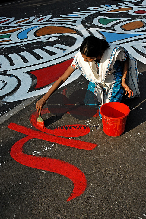 Students of the Institute of Fine Arts paint alpona (color designs) on the road in front of Shahid Minar (Martyr's Monument) 8 hours before the occasion of the International Mother Language Day on 21 February 2007. Dhaka, Bangladesh.