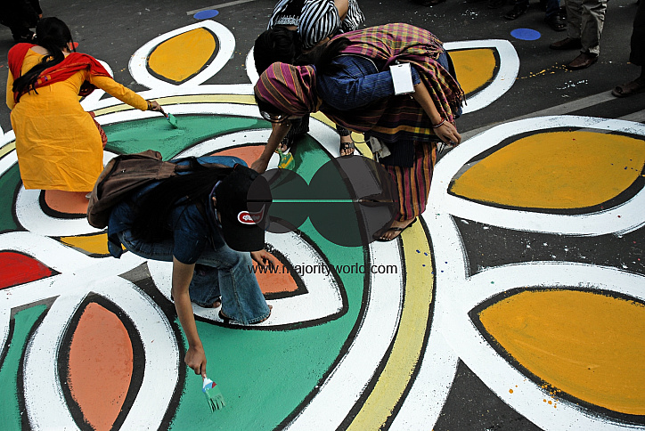 Students of the Institute of Fine Arts paint alpona (color designs) on the road in front of Shahid Minar (Martyr's Monument) 8 hours before the occasion of the International Mother Language Day on 21 February 2007. Dhaka, Bangladesh.