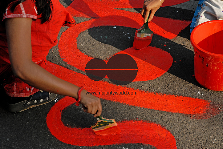 Students of the Institute of Fine Arts paint alpona (color designs) on the road in front of Shahid Minar (Martyr's Monument) 8 hours before the occasion of the International Mother Language Day on 21 February 2007. Dhaka, Bangladesh.