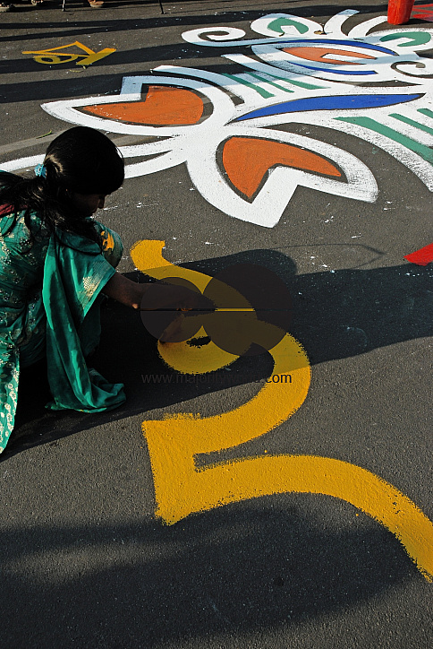 Students of the Institute of Fine Arts paint alpona (color designs) on the road in front of Shahid Minar (Martyr's Monument) 8 hours before the occasion of the International Mother Language Day on 21 February 2007. Dhaka, Bangladesh.