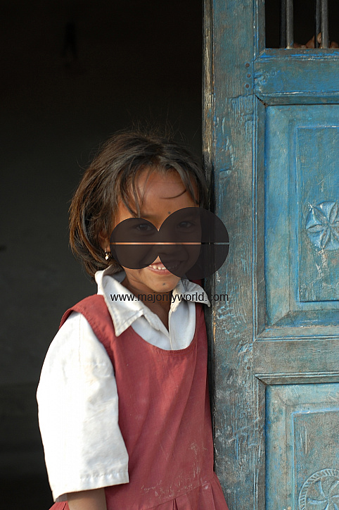 India: In her school uniform, this girl was standing at the entrance of her house when this lovely light fell on her face and she burst into this smile. 07-Mar-07.