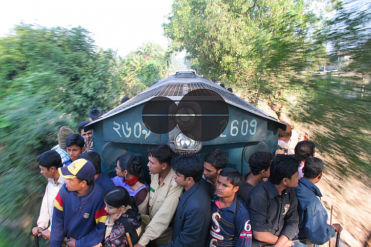 Students of Chittagong University travelling on a shuttle train travelling between their campus and the main city in Chittagong 21 km away. The two shuttle trains are the main transport to the varsity, but limited compartments lead students to the roof. N