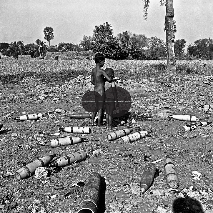 Two boys stand among rocket bombs left by Pakistani army at the picnic corner in Jessore, Bangladesh. December 11, 1971..The Bangladesh Liberation War or Mukti Juddho in Bangla, was a war between West Pakistan (now Pakistan) and East Pakistan (now Bangladesh), from 26 March until 16 December 1971. The war started as an insurgency in East Pakistan. Indian support for the insurgency resulted in war between India and Pakistan (the Indo-Pakistani War of 1971), during which Pakistani forces deployed in the East. The war resulted in East Pakistans independence as the new nation of Bangladesh. (Source:Wikipedia)