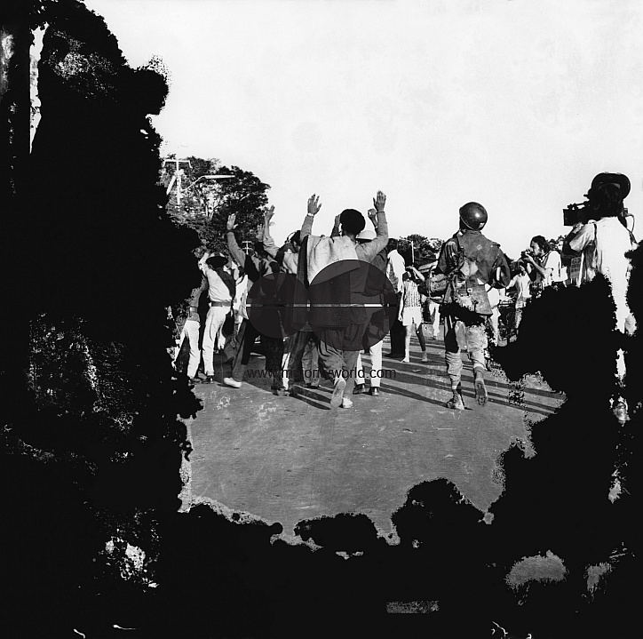 16th December 1971: on their way to surrender at Ramna Park, a group of Pakistani soldiers have a brief skirmish with the Mukt Bahini (freedom fighters) in front of Hotel Intercontinental. Moments later the soldiers surrendered with their hands raised. Ba