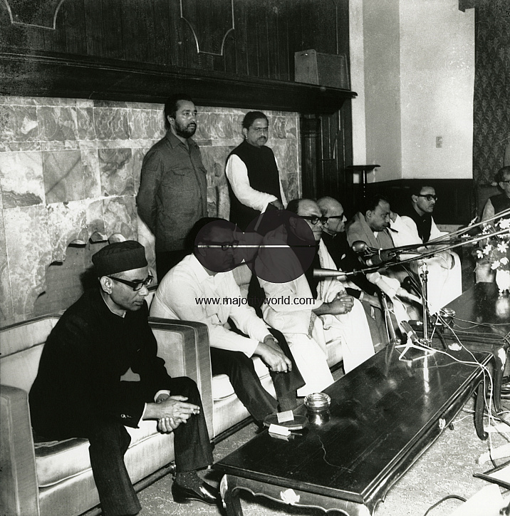 December 28, 1971: The first press conference of the government of Mujibnagar Independent Bangladesh in Governor House, now known as Bangabhaban, in Dhaka, Bangladesh. From left: Khondakar Mostaq, Prime Minister Tajuddin Ahmed, Acting President Syed Najrul Islam, Captain Mansur Ali, Kamruzzaman and Sheikh Abdul Aziz.