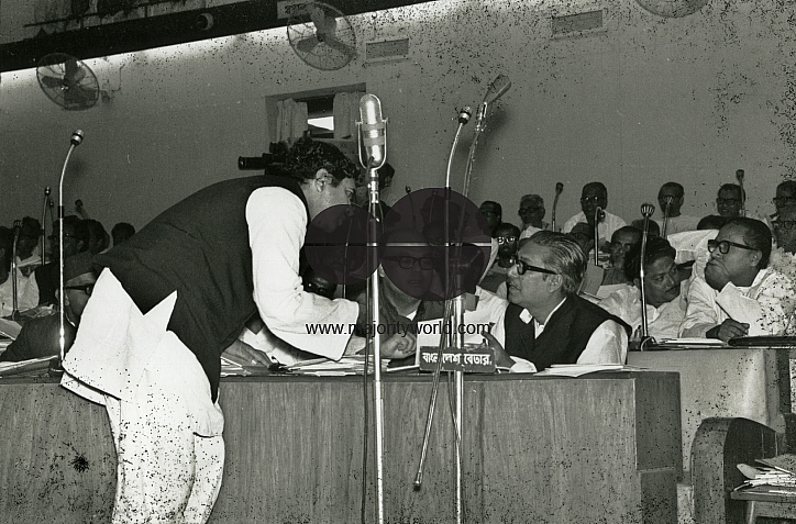 Discussion before the Parliamentary session begins. From right, Bangabandhu, Sayed Najrul Islam, Dr. Kamal Hossain. Dhaka, Bangladesh. 1973.