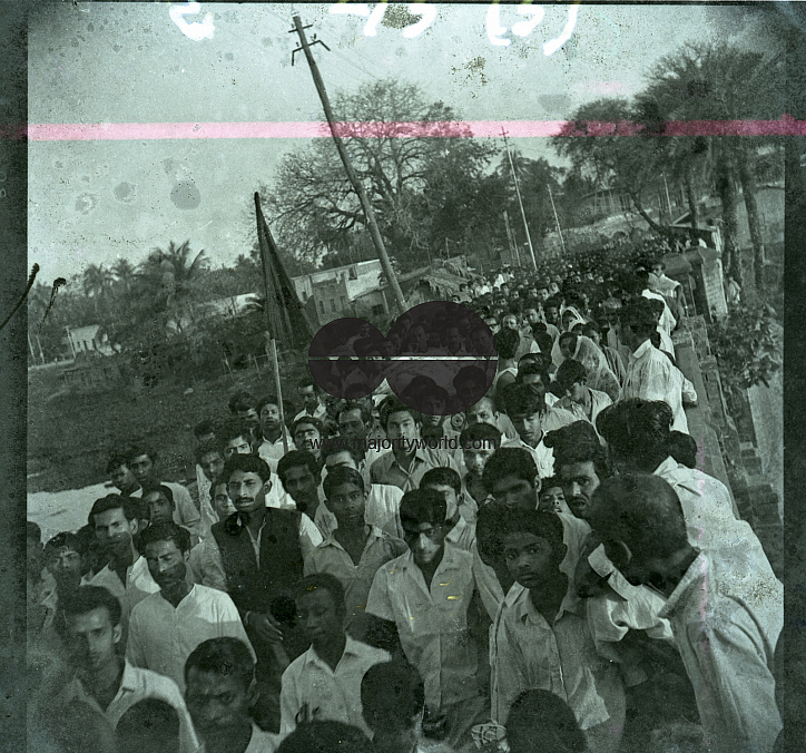A rally of rebellious Bengalis with Black flag and the dead body of Charubala, a house wife, killed by a stray bullet during a shoot out of Pakistani military on a rally against the government of Yahya Khan, in front of Jessore Telephone Exchange on March 3, 1971. Jessore, East Pakistan.